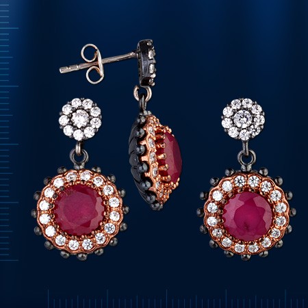 Высота Серьги ок. 38,0 мм, ширина около 16,0 мм. Рубин ¢ 9,0 мм., Фианиты ¢ 2,0 мм