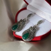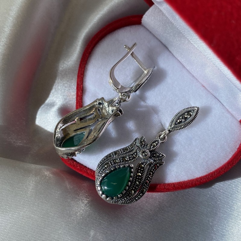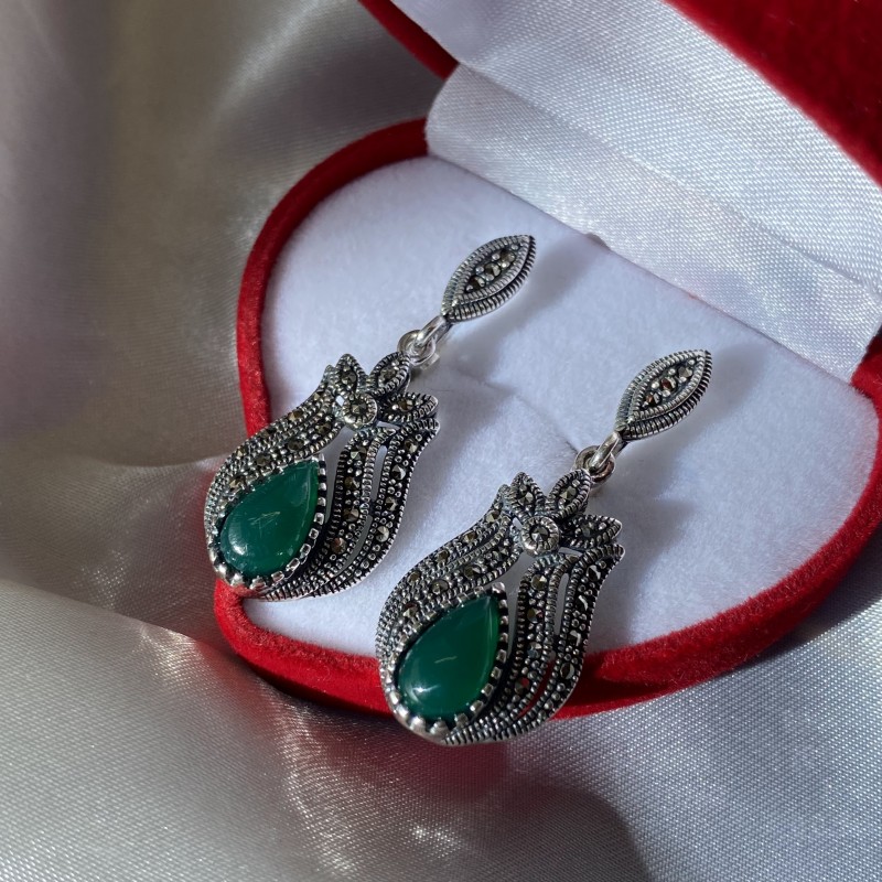 Шикарные серьги в этническом османском стиле, изготовленные вручную из черненого серебра 925 пробы с крупной вставкой из хризопраза и глубокого марказита! Серьги украшены ажурным рельефным узором, подчеркивающим античный стиль изделия.