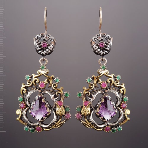 Серьги из черненного серебра 925° с аметистом, рубины и изумруды, бронза