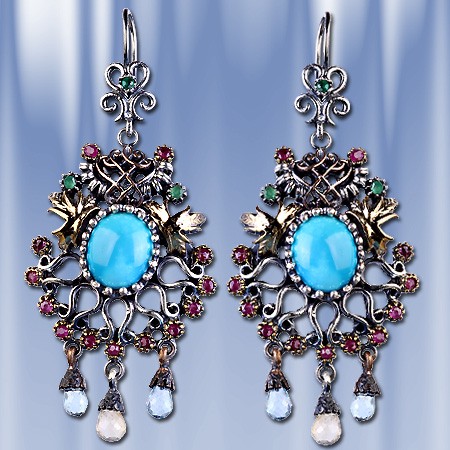 Серьги из черненного серебра 925° с бирюзой, рубинами, изумрудами, топазом, цитрином. Высота ок. 70 мм. Ширина ок. 30 мм. Серьги с французским замком - просто, надежно и долговечно.