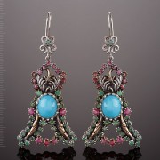 Серьги из черненного серебра 925° с бирюзой, рубины и изумруды, бронза