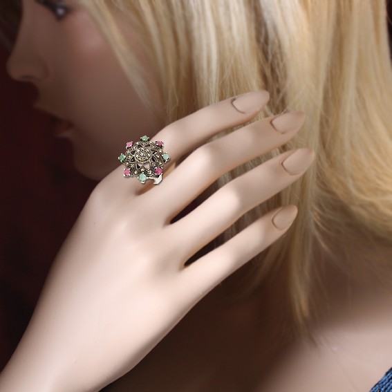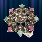 Эксклюзивное кольцо ручной работы из черненного серебра 925 пробы в форме цветка, украшенное натуральными рубинами, изумрудами и марказитом.