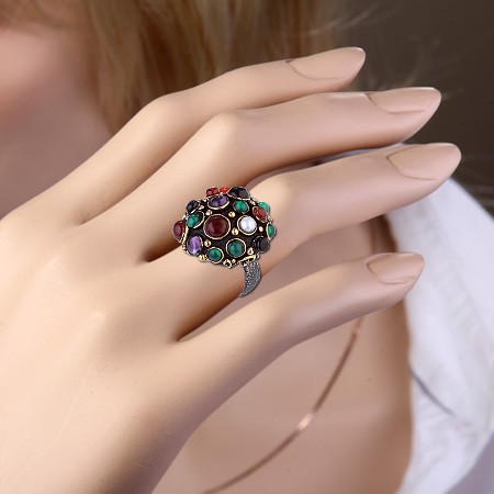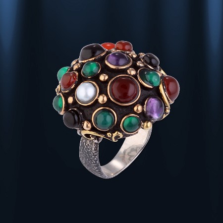 Стильное и роскошное украшение - кольцо из черненого серебра 925°. Вставка: 7 изумрудов Ø 5 мм, жемчужина Ø 5 мм, 3 аметиста Ø 5 мм, 6 гранатов Ø 6 мм, Ø 4 мм. Диаметр около 28 мм.