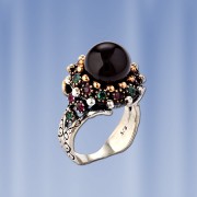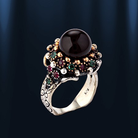 Эксклюзивное кольцо ручной работы из черненного серебра 925 пробы, украшенное натуральным агатом Ø 10 мм, рубинами Ø 2 мм и 2 изумрудами Ø 2 мм. Позолоченный