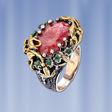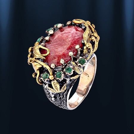 Эксклюзивное кольцо ручной работы из черненного серебра 925 пробы, украшенное натуральным рубином (13 х 15 мм), 9 изумрудами Ø 2 мм. Позолоченный.