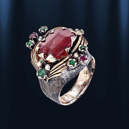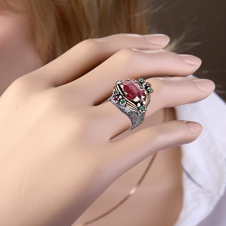 Эксклюзивное кольцо ручной работы из черненного серебра 925 пробы, украшенное натуральным рубином (10 х 15 мм), 2 рубинами Ø 2 мм и 6 изумрудами Ø 2 мм. Позолоченный.