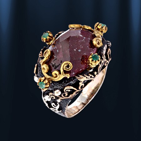 Эксклюзивное кольцо ручной работы из черненного серебра 925 пробы, украшенное натуральным рубином (13 х 20 мм), 4 изумрудами Ø 2 мм. Позолоченный.