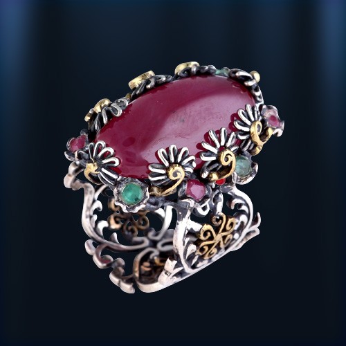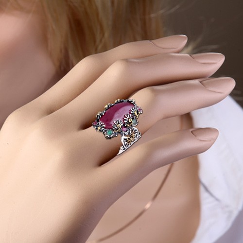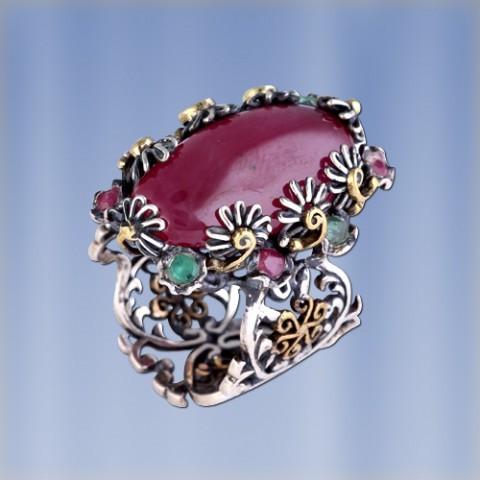 Эксклюзивное кольцо ручной работы из черненного серебра 925 пробы, украшенное натуральным рубином (22 х 13 мм), 4 рубинами Ø 2 мм, 4 изумрудами Ø 2 мм. Бронза