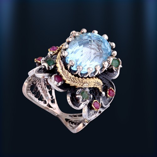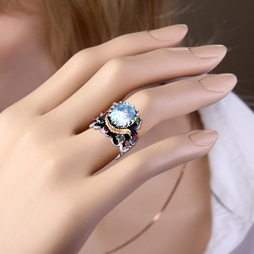 Эксклюзивное кольцо ручной работы из черненного серебра 925 пробы, украшенное натуральным топазом (15 х 10 мм), 6 рубинами Ø 2 мм, 4 изумрудами Ø 3 мм. Бронза