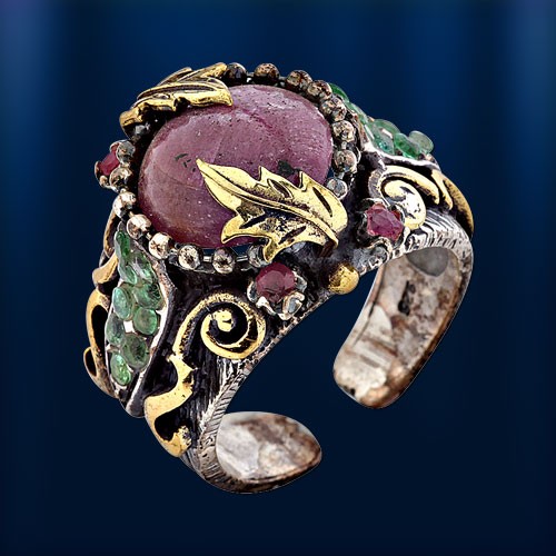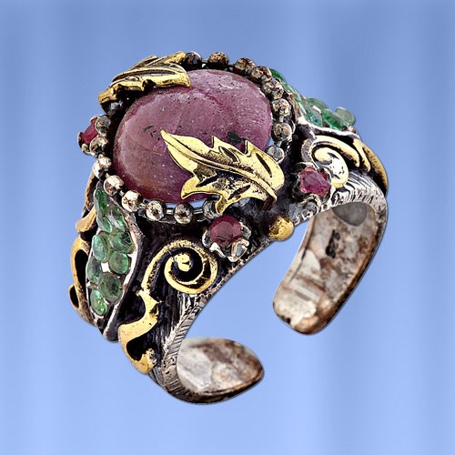 Кольцо из черненного серебра 925° с изумрудами и рубины, бронза