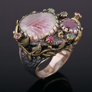 Кольцо из черненного серебра 925° с Аметист, кварц, изумруд и рубины, бронза