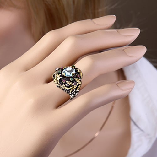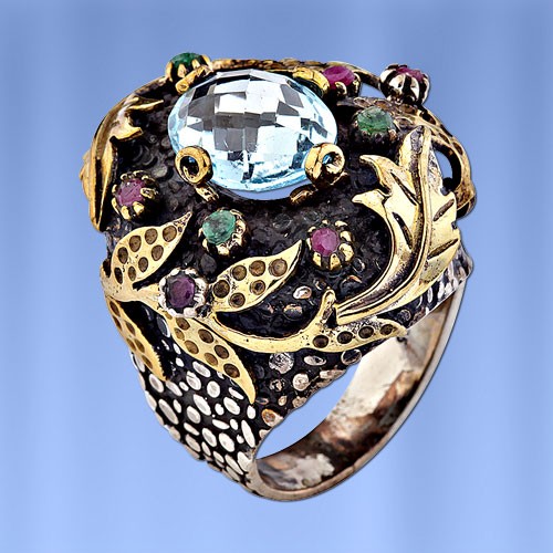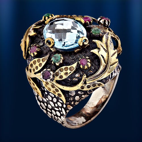 Кольцо из черненого серебра 925°, бронза< бр /> Вставьте: Топаз< /span> (12,0 x 10,0 мм), Изумруды и рубины ¢ 2,0 мм
