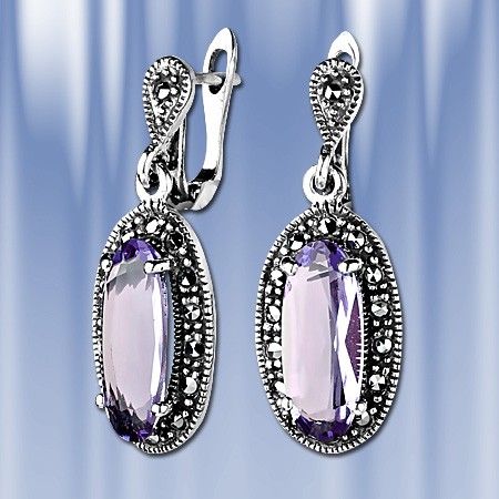 Серьги из черненого серебра 925°. Вставка: синтетический аметист и тент. Высота ок. 32 мм.