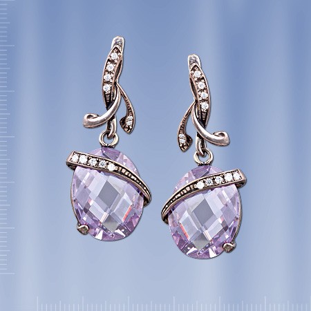 Серьги из черненного серебра 925°, украшенные синтетическим аметистом (20 х 15 мм) и цирконием ¢ 2 мм. Длина около 42 мм. Серьги с английским замком