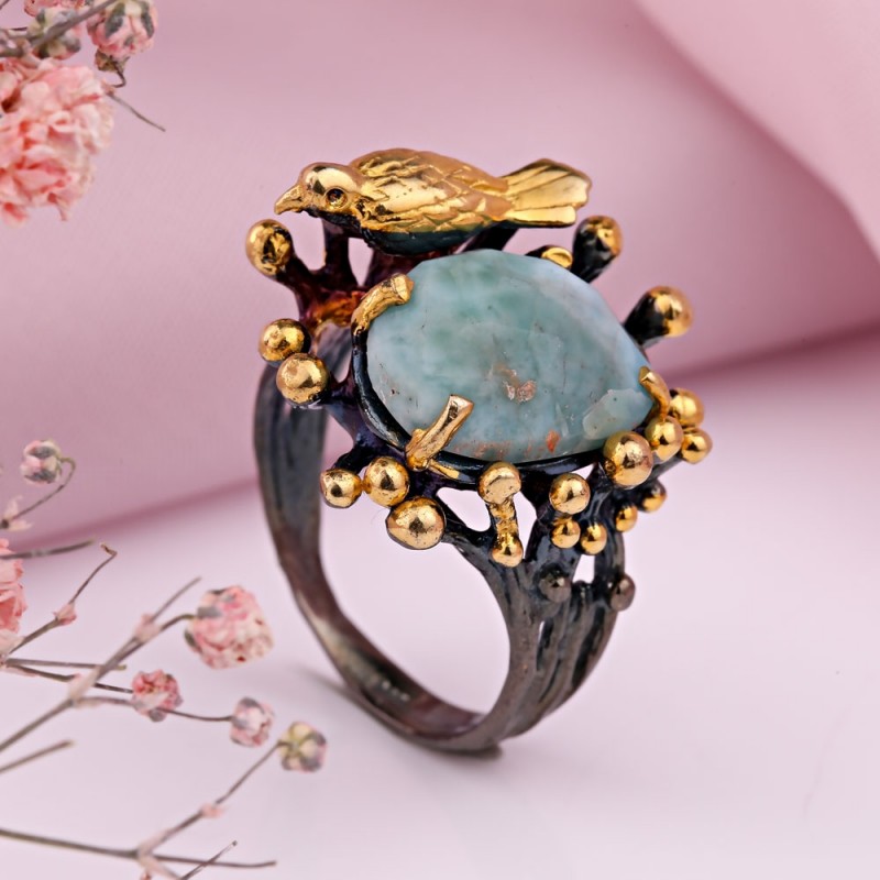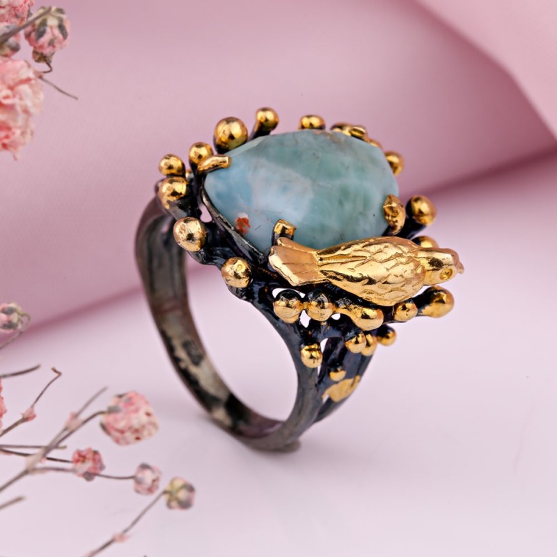 Очаровательное кольцо из черненого серебра 925 пробы с покрытием из массивного желтого золота, украшенное красивой крупной бирюзой. Благодаря умело расставленным акцентам с помощью позолоты кольцо выглядит неповторимо красиво. Отличное дополнение вашего образа женственности и романтики.