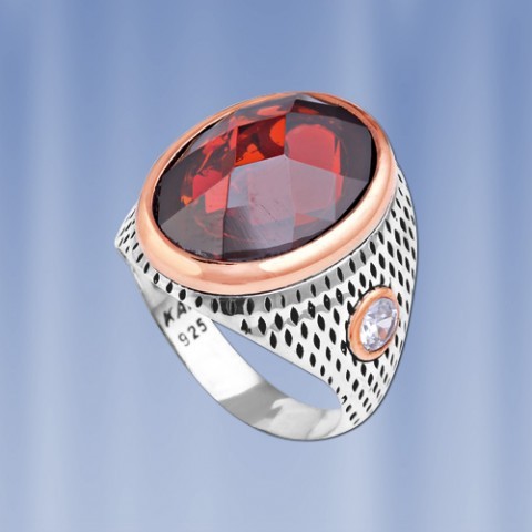 Мужское кольцо из серебра 925°, украшенное бронзовым напылением с синтетическим гранатом (18 х 13 мм) и фианитами ¢ 5 мм. Высота ок. 22 мм.