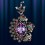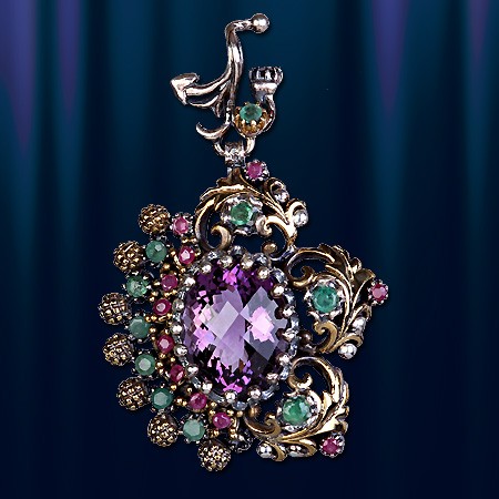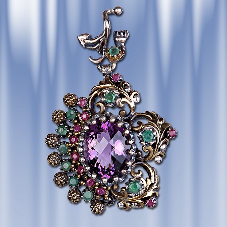Стильный и роскошный ювелирный кулон с крупной вставкой из аметиста (18 х 14 мм.), который красиво обрамлен 11 рубинами (диаметр 3 мм), 7 изумрудами (диаметр 3 мм) и 3 изумрудами (диаметр 4 мм). Серебро 925°. Высота 55 мм, ширина 37 мм, вес 14,5 г.