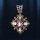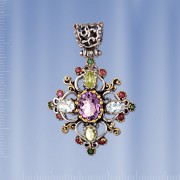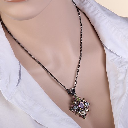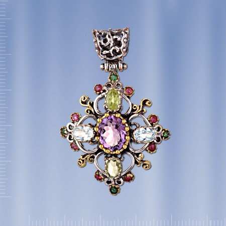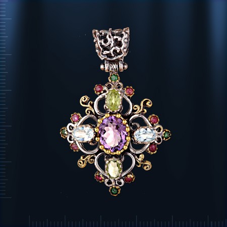 Стильный и роскошный ювелирный кулон с крупной вставкой аметиста (10 х 8 мм), красиво украшенный 8 рубинами (диаметр 2 мм), 4 изумрудами (диаметр 2 мм), 2 топазами (6 х 4 мм), 2 Хризолит (6 x 4 мм) обрамлены. Серебро 925°. Высота 48 мм, ширина 32 мм.