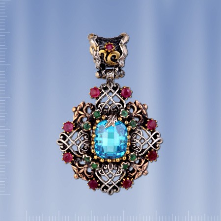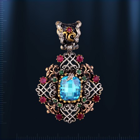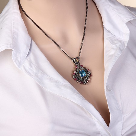 Стильный и роскошный ювелирный кулон из черненого серебра 925° с крупной вставкой Аквамарина (11 х 13 мм), красиво украшенной 9 рубинами ¢ 3 мм, 8 изумрудами ¢ 2 мм. мм оформлены в рамку. . Высота 50 мм, ширина 33 мм.
