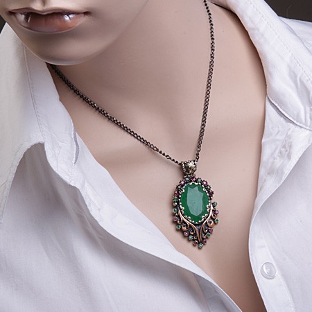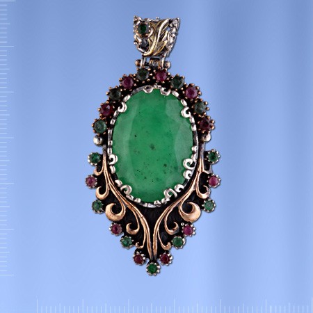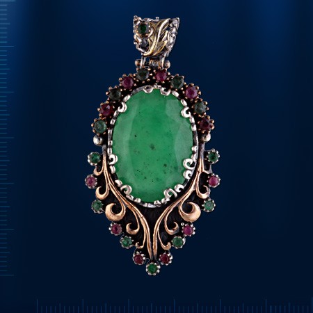 Стильный и роскошный ювелирный кулон с крупной вставкой изумрудов (27 х 18 мм.), которые красиво обрамлены 11 рубинами Ø 2 и Ø 2,5 мм и 13 изумрудами Ø 2 и Ø 2,5 мм. Серебро 925°.