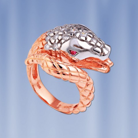 Кольцо из серебра 925°, украшенное бронзой в форме змеи. Цирконий ¢ 2 мм.