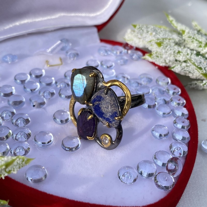 аметистом, содалитом и разноцветными циркониями. Благодаря умело расставленным акцентам с помощью позолоты кольцо выглядит неповторимо красиво. Отличное дополнение вашего образа женственности и романтики.