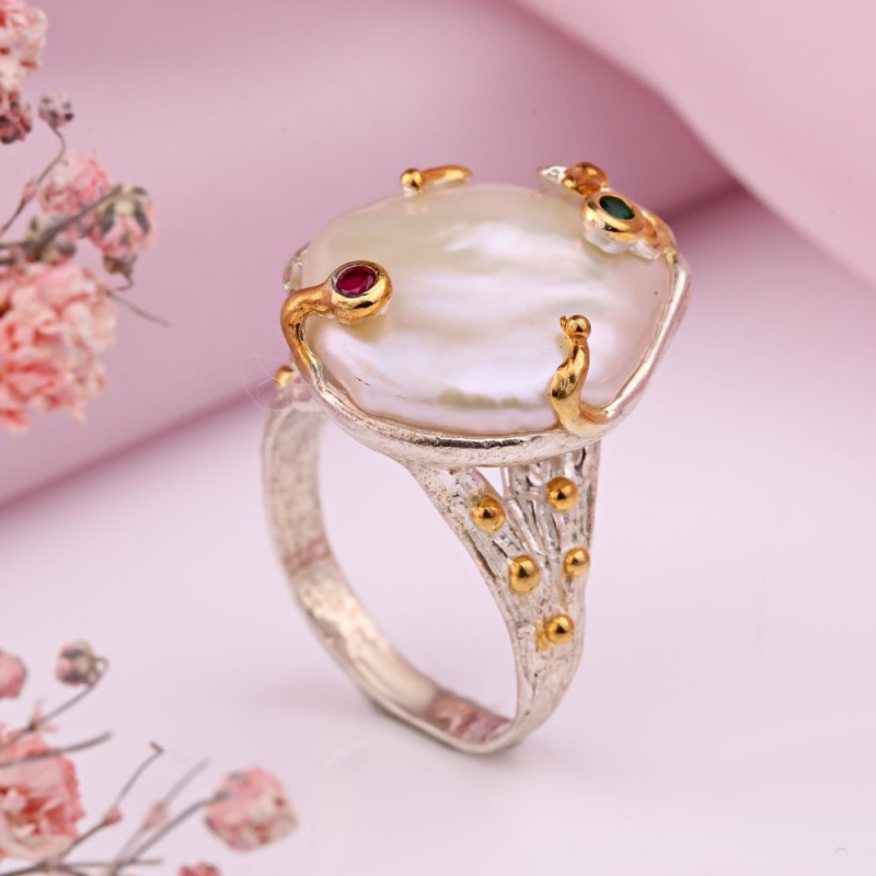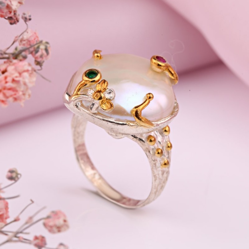 жемчугом в стиле барокко и разноцветными циркониями. Благодаря умело расставленным акцентам с помощью позолоты кольцо выглядит неповторимо красиво. Отличное дополнение вашего образа женственности и романтики.