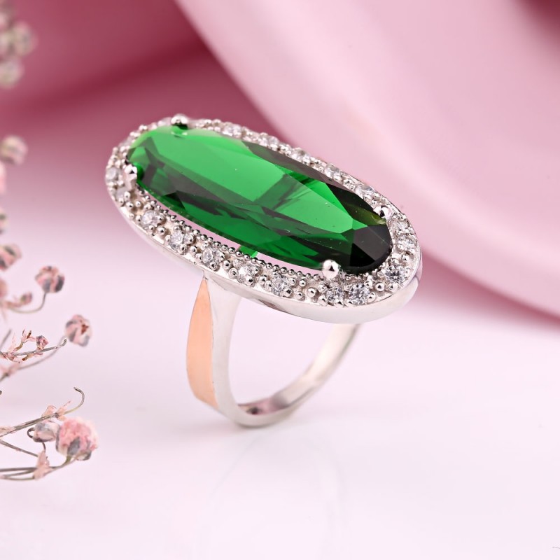 Удивительно нежное кольцо с очаровательными сверкающими циркониями и крупными зелеными
