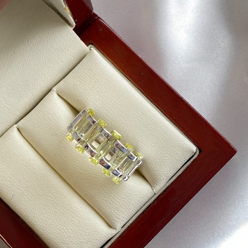 Восхитительное, роскошное кольцо с очаровательными сверкающими крупными фианитами лимонного цвета. Кольцо выглядит лаконично и стильно в красивой оправе из серебра 925 пробы, создавая яркую и живую композицию. Он прекрасно подчеркнет нежность, очарование и естественную красоту ваших рук! Оригинальный дизайн кольца отразит вашу индивидуальность!