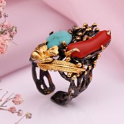 Очаровательное кольцо из черненого серебра 925 пробы с покрытием из цельного желтого золота, украшенное красивой крупной бирюзой и кораллом. Благодаря умело расставленным акцентам с помощью позолоты кольцо выглядит неповторимо красиво. Отличное дополнение вашего образа женственности и романтики.