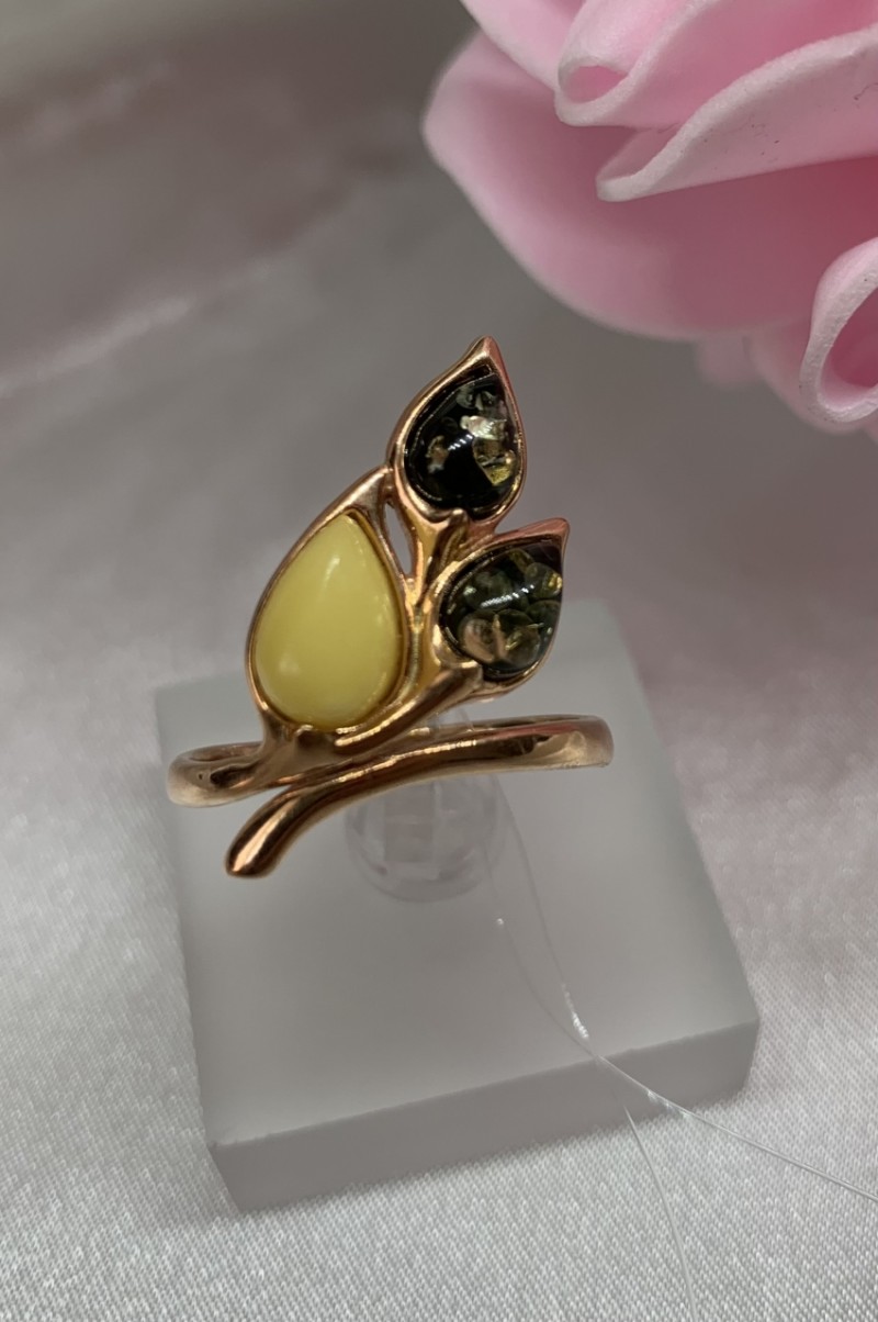 Элегантное кольцо из серебра 925 пробы, с позолотой, украшенное королевским и зеленым янтарем, с этим удивительным «кусочком солнца»! Кольцо прекрасно подчеркнет нежность, очарование и естественность вашей красоты и привлечет внимание к женственности ваших рук.