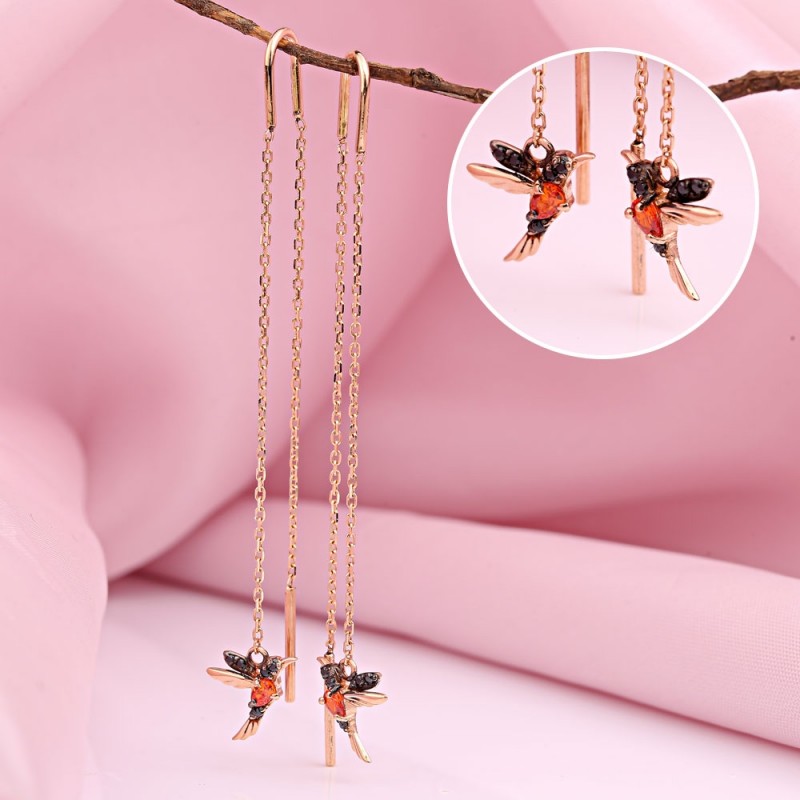 На U-образном замке раскачиваются свободно закрепленные цепочки с подвеской в виде колибри со вставками из сапфиров и цирконий. К задней части замка также прикреплены свободно качающиеся цепи. Серьги всегда в движении, выглядят оригинально и красиво и привлекают всеобщее внимание к своей хозяйке!