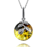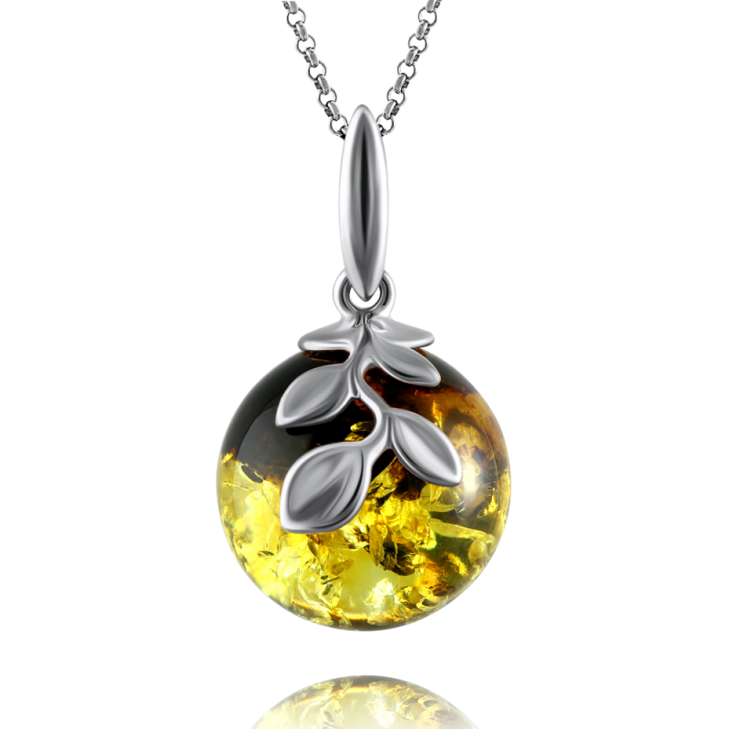 Очаровательный кулон из родиевого серебра 925 пробы и уникального янтаря, с этим удивительным «кусочком солнца», играющим всеми оттенками меда.