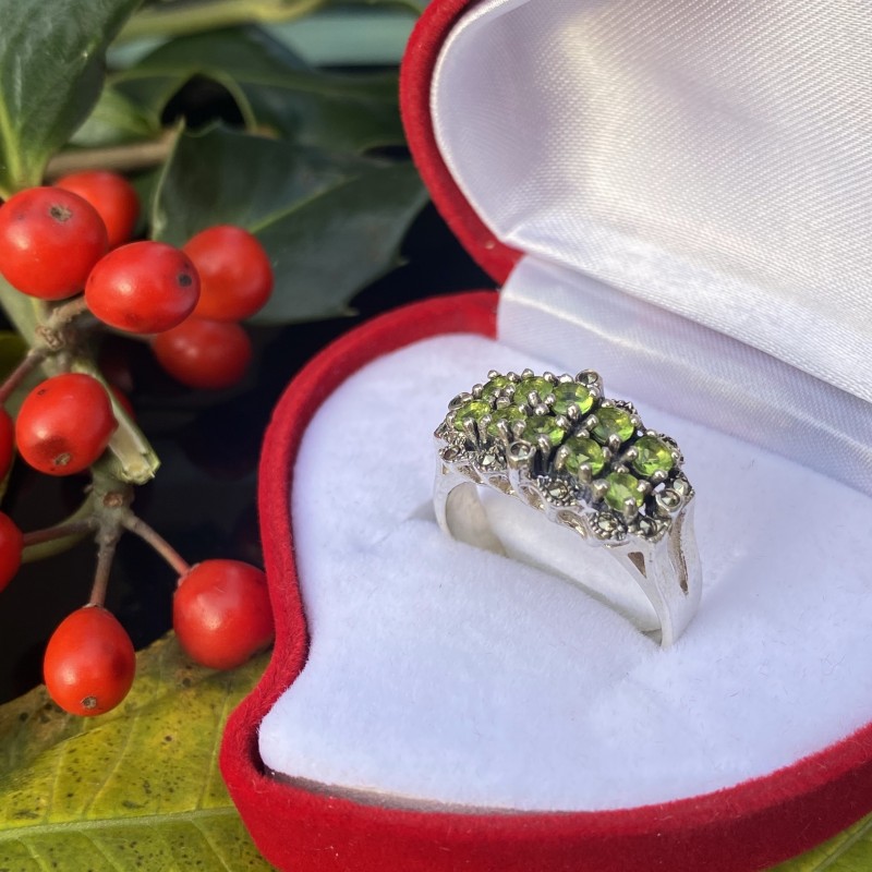 Оригинальное кольцо из черненого серебра 925 пробы со вставками из глубокого марказита и зеленого циркония. Это кольцо представляет собой удивительное сочетание элегантности, легкости и индивидуальности, что придает украшению особый шарм и вдохновение.
