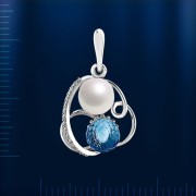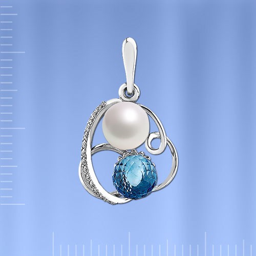 Кольцо из белого золота 585°, украшенное жемчугом 6,0 х 6,5 мм, топазом ¢ 6,0 мм, 14 фианитами ¢ 1,0 мм.