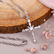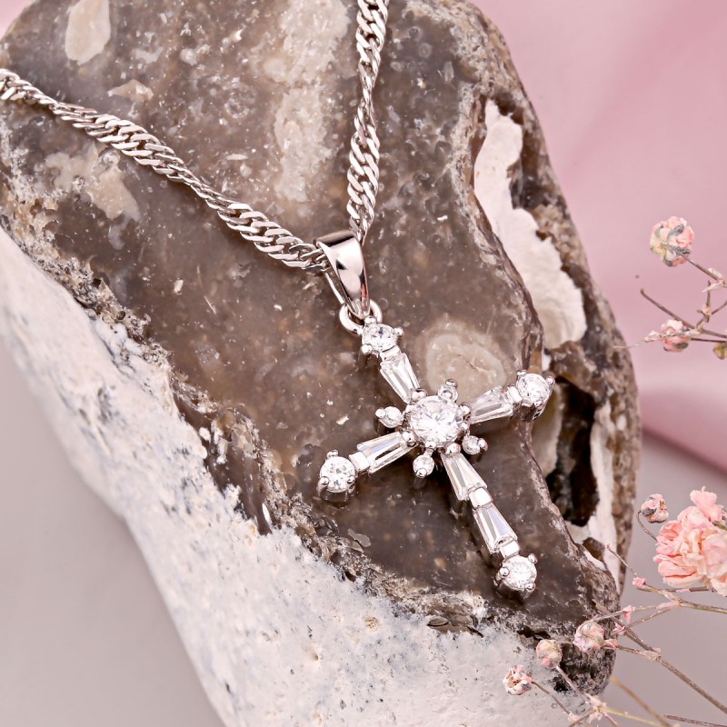 Kríž bez tela je vyrobený z 925 šterlingového striebra a je nastavený so zirkóniami v rôznych tvaroch, ktoré vytvárajú jemnú iskru. Jednoduchý dizajn a presné spracovanie robí z šperku všestrannú voľbu pre každodenný život a špeciálne príležitosti.