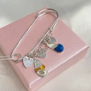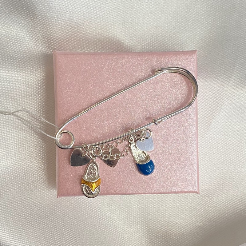 Strieborný špendlík 925 má prívesok s retiazkou zdobený striebornými srdiečkami a farebnými smaltovanými sandálmi (žltá, modrá).