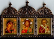 Ruská ikona pre auto, trója, zlato-čierny rám s krížikmi. Казанская Божья Матерь, Христос-Спаситель, и Николай Чудотворец. Нобратной стороне коны меется липучка для крепления коны в салоне ля.