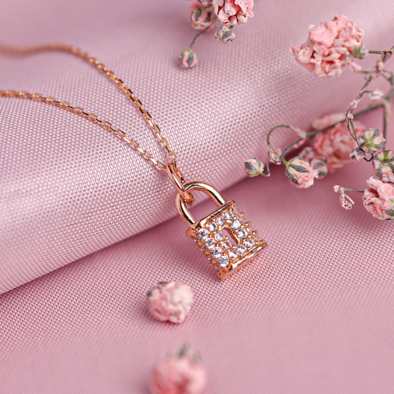 Jemný a romantický náhrdelník vyrobený z červeného zlata 585 s použitím kubických zirkónov. Kotvové tkanie s diamantovým výbrusom.