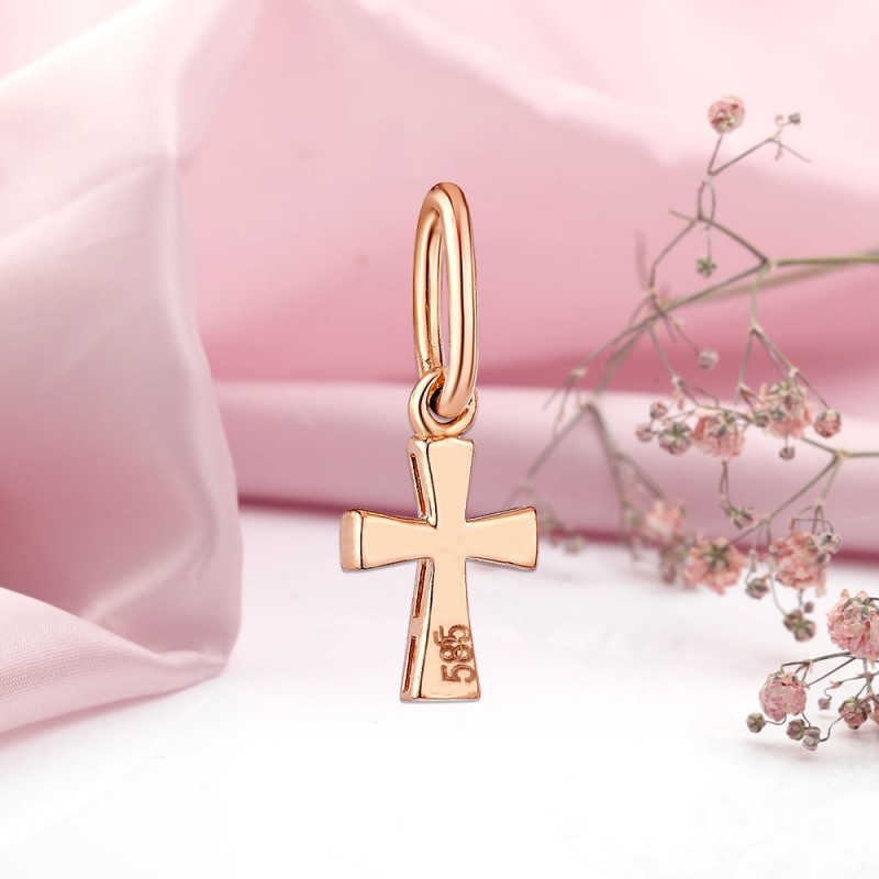 Križni obesek za zapestnice/verižice iz rdečega zlata 585. Križ pri uporabi ne praska.