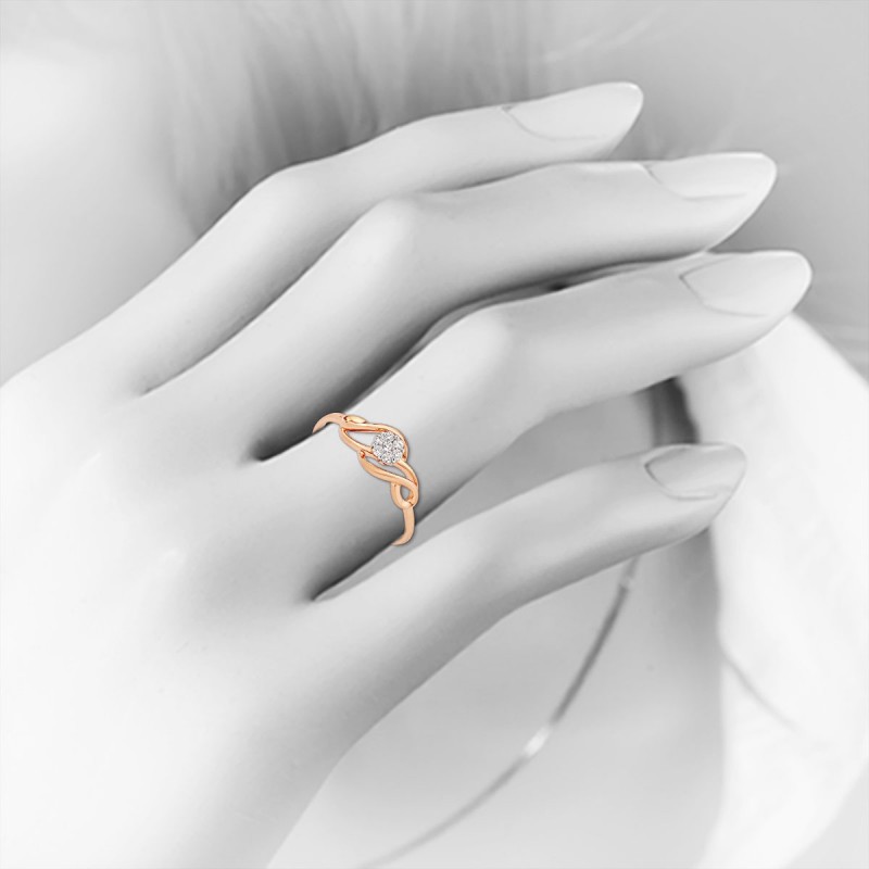 Kupite diamantni prstan. Nežna milost, ujeta v plemeniti kovini - ta izvrsten model prstana iz rodiniranega rdečega zlata 585 je bil ustvarjen za vse, ki cenijo fino lepoto, mehak sijaj in brezhiben stil. Ukrivljene linije spominjajo na lahkotnost nežnega dotika in simbolizirajo harmonijo občutkov in krhkost trenutka. Nežni prepleti dajejo obliki zračno, skoraj breztežno silhueto, medtem ko bleščeča diamantna kompozicija v sredini zasije kot cvetoča čaša – posejana s sijajem jutranje rose.