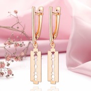 Cena visečih zlatih uhanov. Ti uhani interpretirajo obliko rezila na nežen, tekoč način - kot črta svile. Podolgovata silhueta s finim notranjim izrezom je videti lahka in elegantna, skoraj kot gibanje, ki je bilo ujeto v kovino.