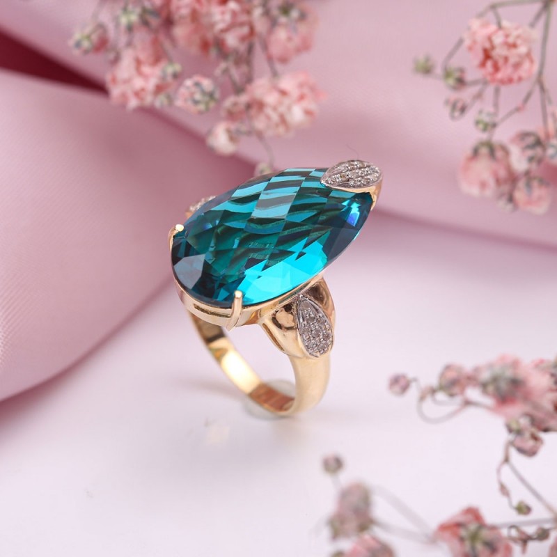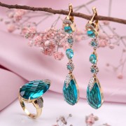 Eleganten komplet iz rumenega/belega zlata 585 z diamanti in akvamarinom, sestavljen iz prstana