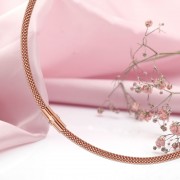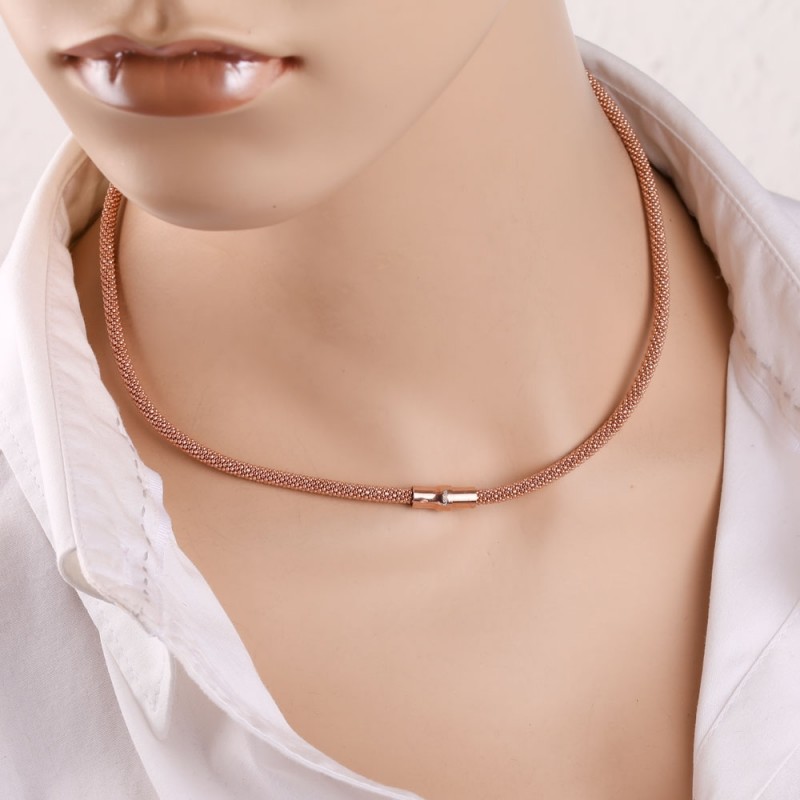 Očarljiva voluminozna ogrlica z obročem iz roza pozlačenega srebra 925, izdelana po posebni tehnologiji. Tkanje pokovke je različica tkanja votle okrogle lupine z nabreklo površino, kot je prava pokovka. Ta tkanina se uporablja za izdelavo nakita, kot so zapestnice, ogrlice in uhani. Zahvaljujoč temu posebnemu tkanju se ogrlica lesketa, kot bi bila opremljena z diamantnimi vložki. Zelo nežna ogrlica, ki bo zagotovo dopolnila vaš romantičen videz!