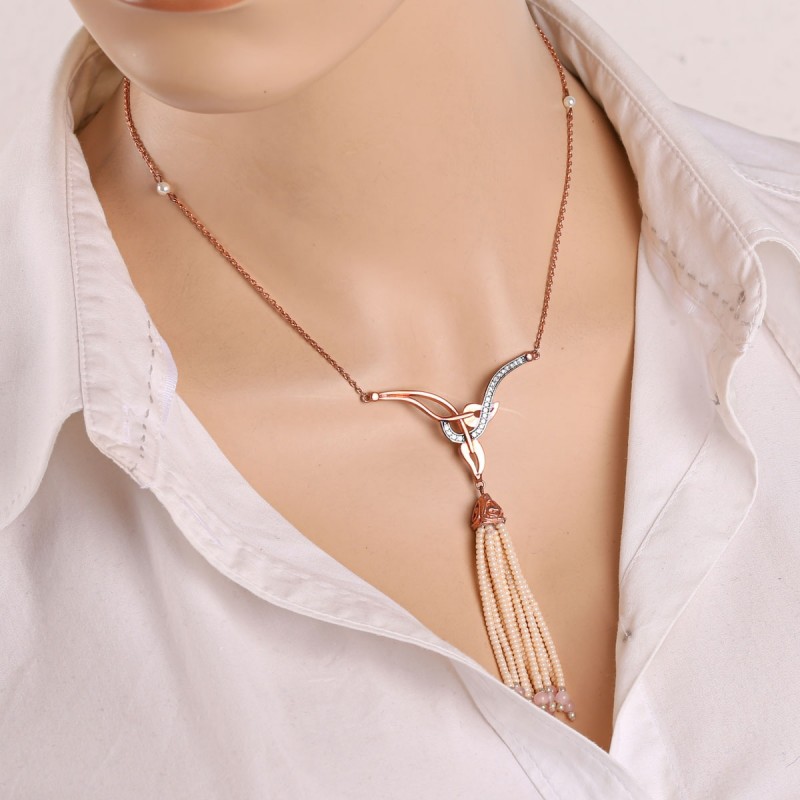 925 Srebrna veriga z biseri, roza kremen in cirkonijo v orientalskem slogu