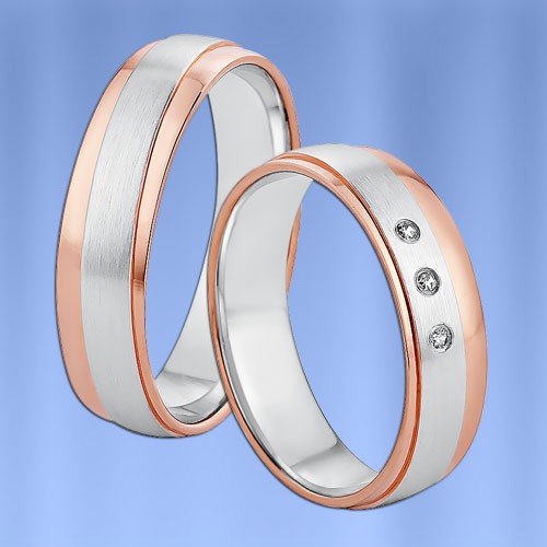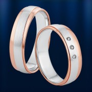 Dvobarvni prstan iz rdečega in belega zlata 585° (mat / sijoče) z diamanti (3 x 0,01 ct)