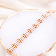 Večvrstna razporeditev podolgovatih členov daje zapestnici osupljivo, skorajda arhitekturno strukturo. Kljub svoji prisotnosti je dizajn videti harmoničen in uravnotežen. Kos nakita se poda tako k elegantnemu vsakdanjemu videzu kot tudi k bolj elegantnim priložnostim ter daje samozavesten vtis.