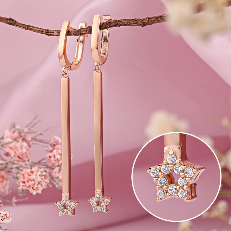 Zlati uhani iz ruskega rdečega zlata 585 s cirkoni. Nežni in ženstveni uhani okrašeni z obeski v obliki zvezdic iz cirkonija. Odlična izbira, da razveselite sebe in svoje najdražje.