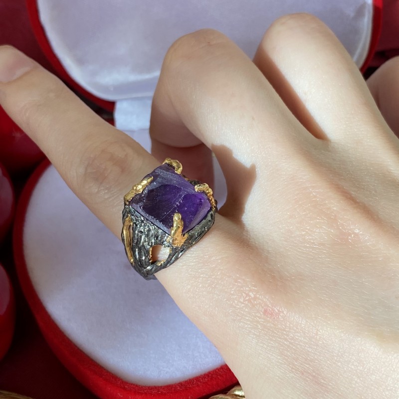 Očarljiv prstan iz črnjenega srebra 925 s prevleko iz masivnega rumenega zlata, okrašen s čudovitim naravnim neobdelanim ametistom. Zahvaljujoč spretno postavljenim poudarkom z pozlačevanjem je prstan videti edinstveno lep. Odličen dodatek k vaši podobi ženstvenosti in romantike.