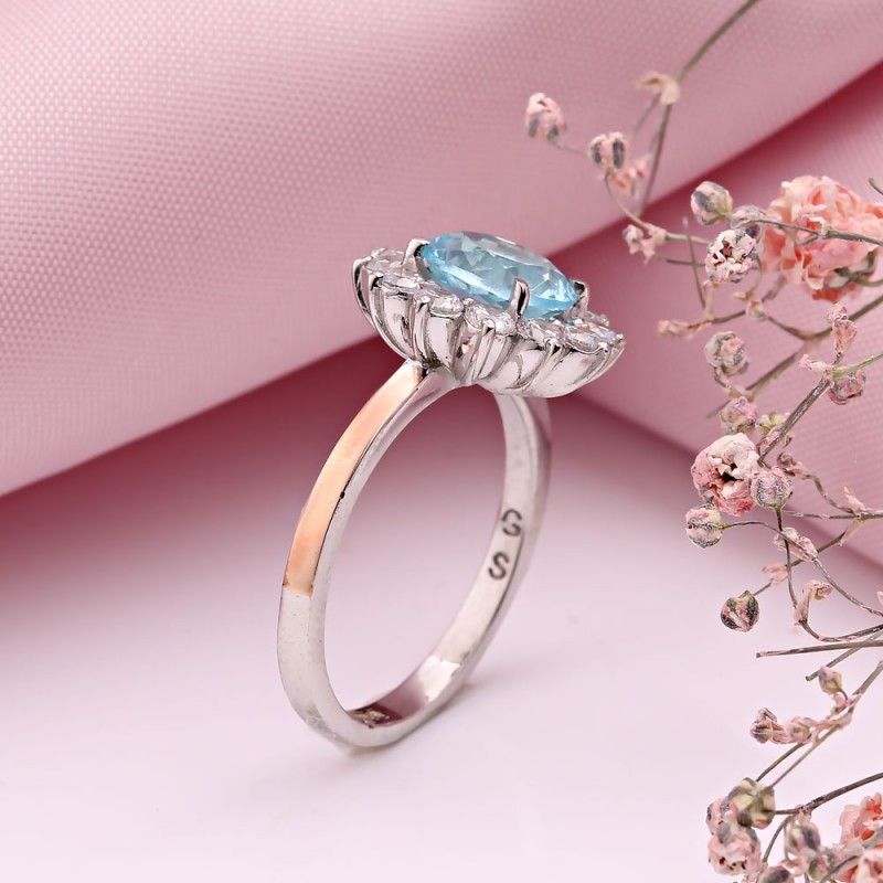 Kupite srebrni prstan z zlatom in cirkonijem. Srebro 925 in zlato 375. Nežen in romantičen srebrn prstan z zlatom in nežno modrimi cirkoni v okvirju iz belega cirkonija. Srebro z zlatimi vložki izgleda zelo bogato in elegantno v primerjavi s klasičnim srebrom. Njen sijaj in lepota bosta čudovito obogatila vašo podobo. Dama s takšnim nakitom bo videti elegantna in prefinjena.
